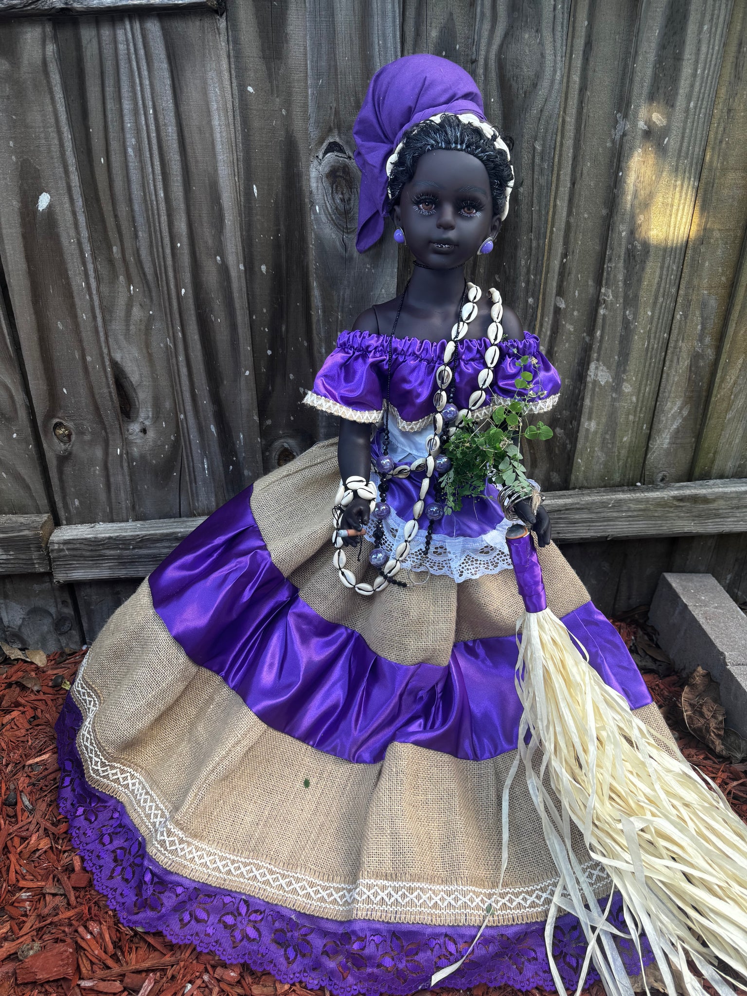 Entre sus manos sostiene sus complementos de trabajo, incluyendo su tabaquito, símbolo de sus prácticas curanderas. Cada detalle fue pensado para reflejar quién fue: una mujer milagrosa, llena de fe, que sanó y alivió a muchos en su tiempo.