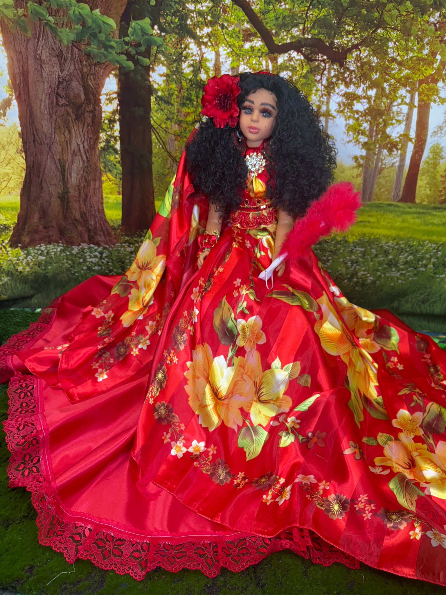 Con su imponente vestido rojo adornado de flores, la flor en el cabello y el abanico de plumas, transmite alegría y vitalidad. Ella representa a una gitana con una belleza natural y espiritualidad que cautiva, convirtiéndose en una pieza especial y diferente.