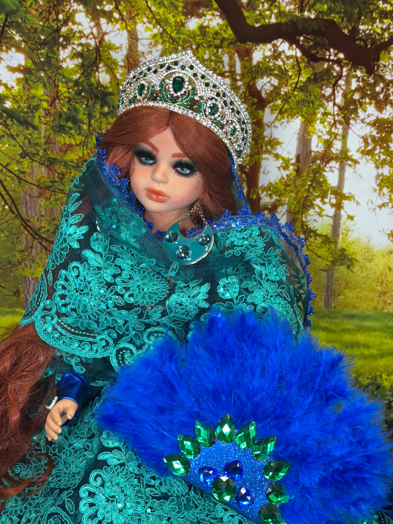 Esta creación mide 28 pulgadas, es completa de goma y está realizada con un nivel de detalle que la convierte en una muñeca de excelente calidad. Su rostro fue trabajado con un realismo excepcional, sus ojos transmiten carácter y fuerza, y su majestuoso vestido está cubierto de encajes y bordados brillantes que irradian lujo. Todo el conjunto está coronado con una tiara imponente, símbolo de realeza y dominio,y también está incluida la corona más sencilla