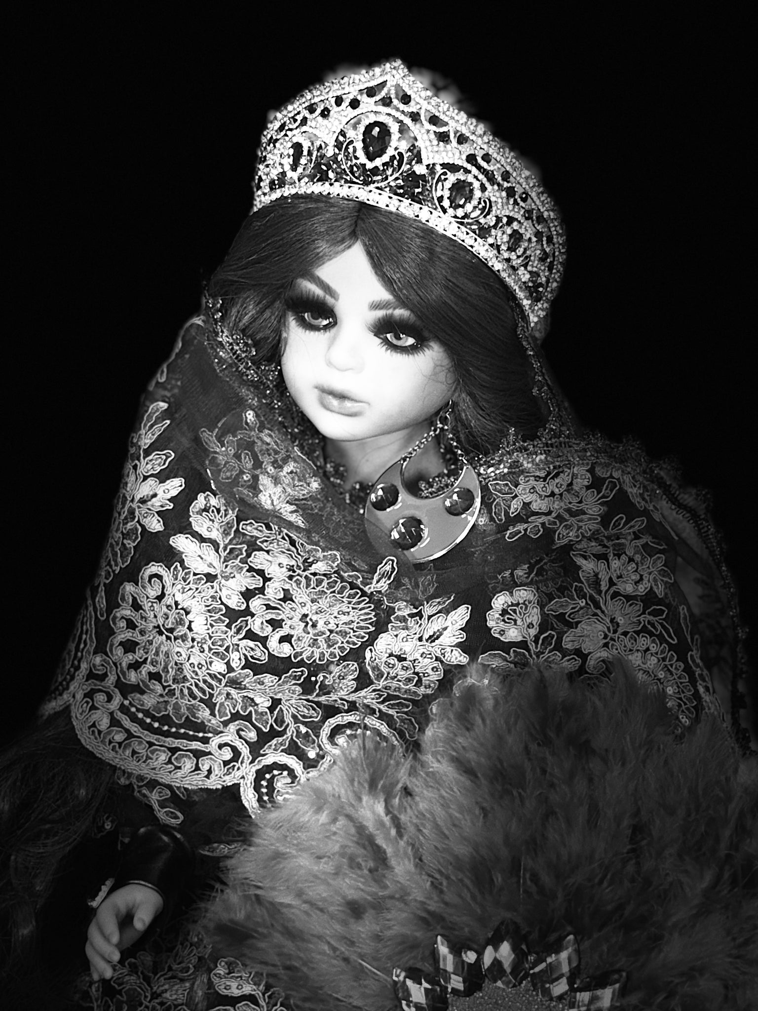 Esta representación es espectacular en todos sus aspectos. Desde los bordados hasta las joyas, desde la postura hasta los accesorios, todo en ella ofrece grandeza, elegancia y realismo. Y, como en todas mis creaciones, es una pieza única: jamás repito ninguna muñeca, cada una recibe un rostro propio e irrepetible.