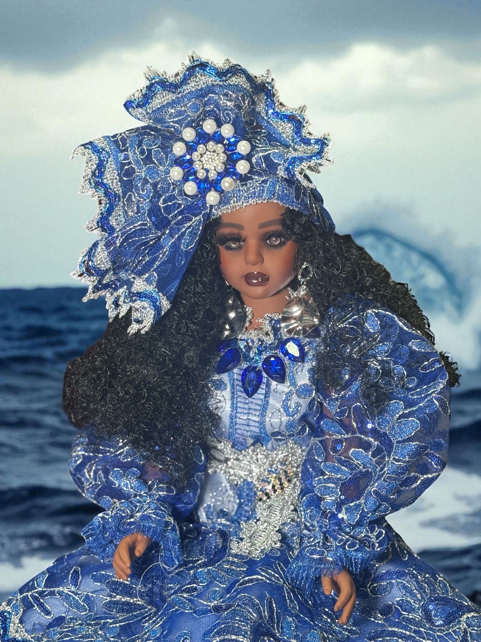 Esta hermosa muñeca de 28 pulgadas de goma completa, representa a Yemaya  Forma parte de una colección especial que estoy produciendo, pensada para quienes desean tener una de mis creaciones a un precio más accesible. Estas muñecas tienen un maquillaje más sencillo, con menos trabajo realista en el rostro, lo que permite ofrecerlas a un costo menor sin perder la esencia de mi trabajo .
