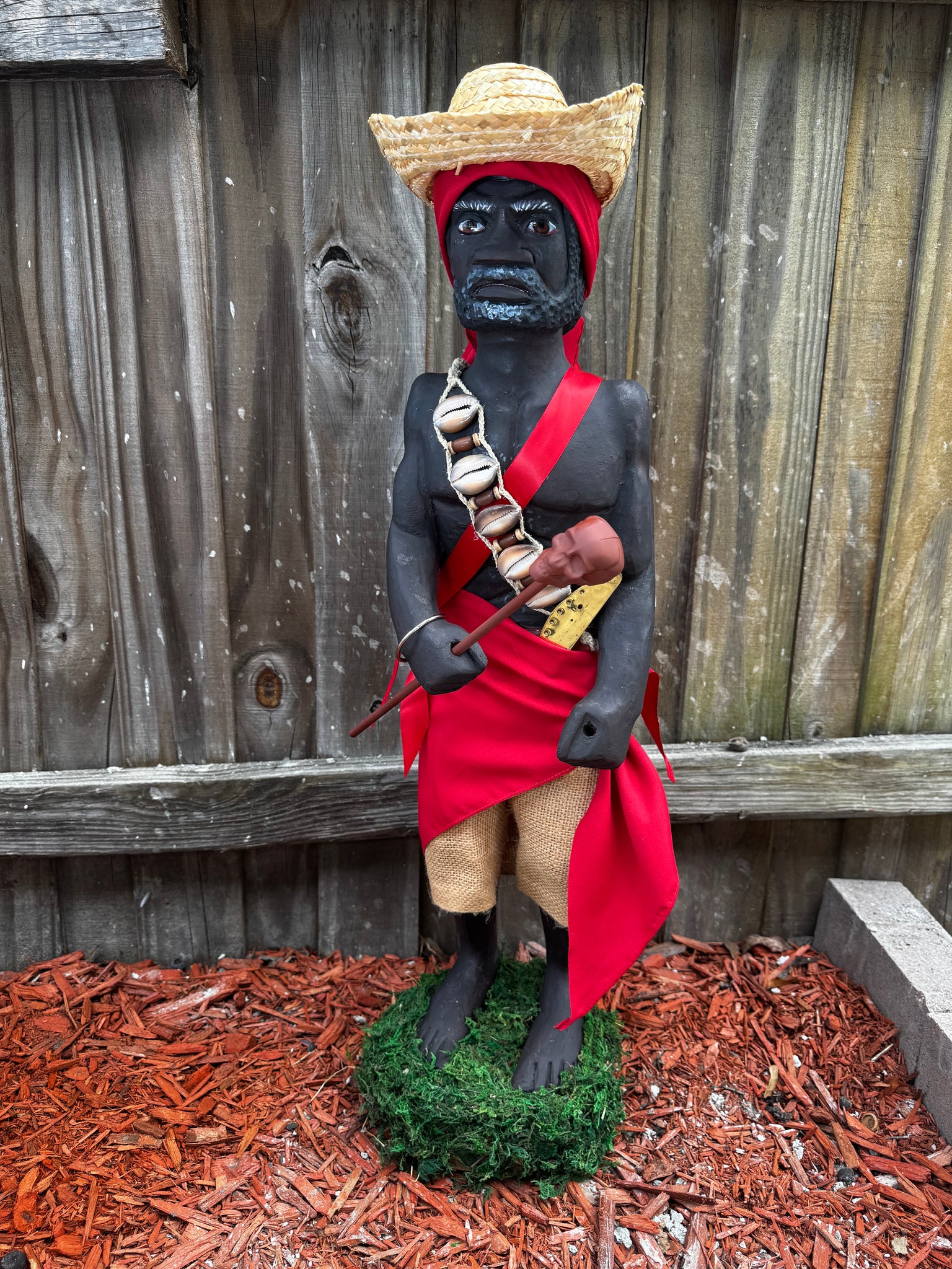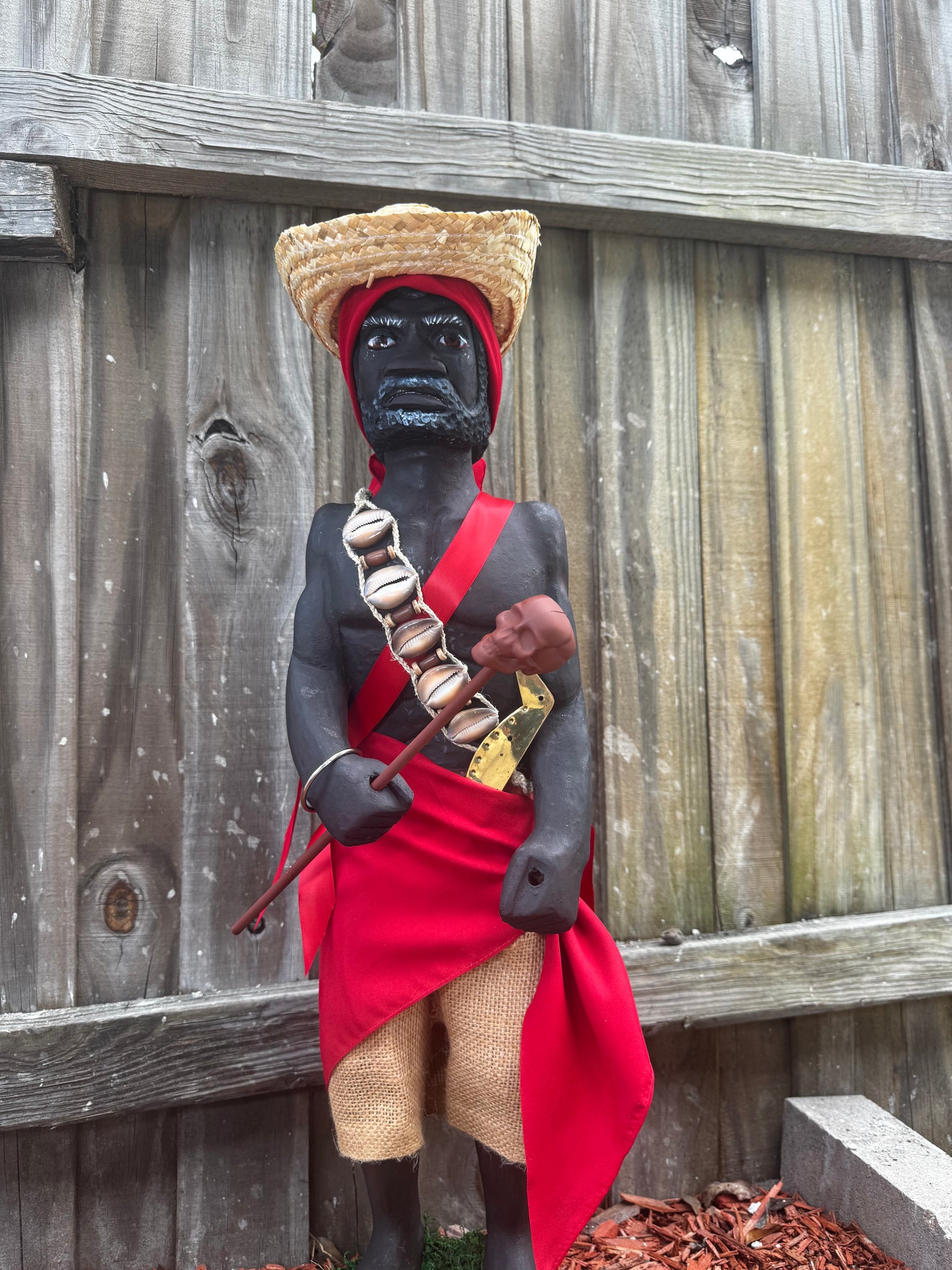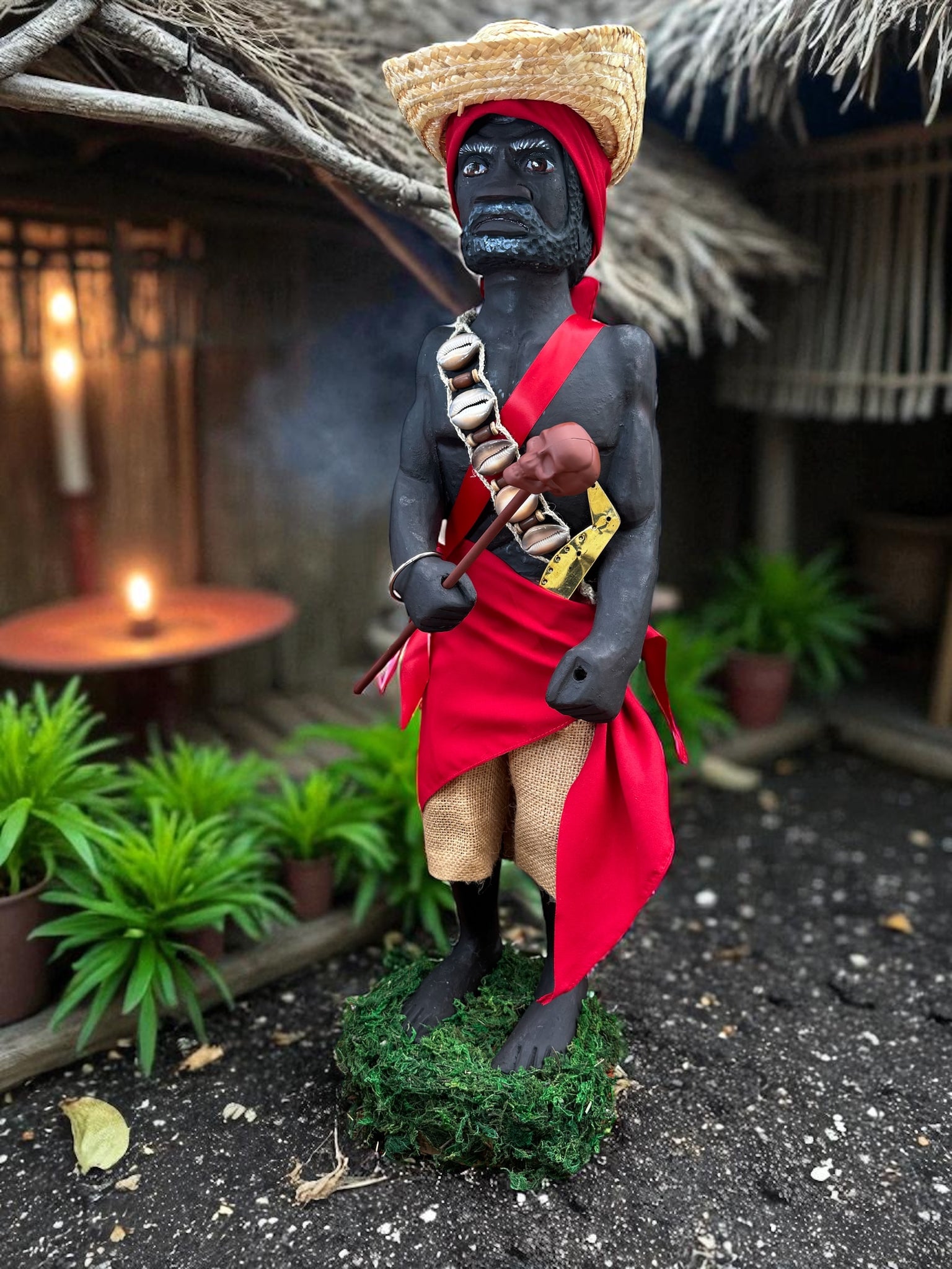 Con sus 28 pulgadas de altura, desde la base hasta el sombrero, se yergue imponente, como un sÃmbolo de respeto y fuerza. Su vestimenta roja vibra con la intensidad del fuego y la pasión, mientras que los caracoles, el bastón y sus accesorios evocan conexión con la tierra, la naturaleza y el misticismo que lo rodea.Agregue algo de saco simulando su short de yuteÂ