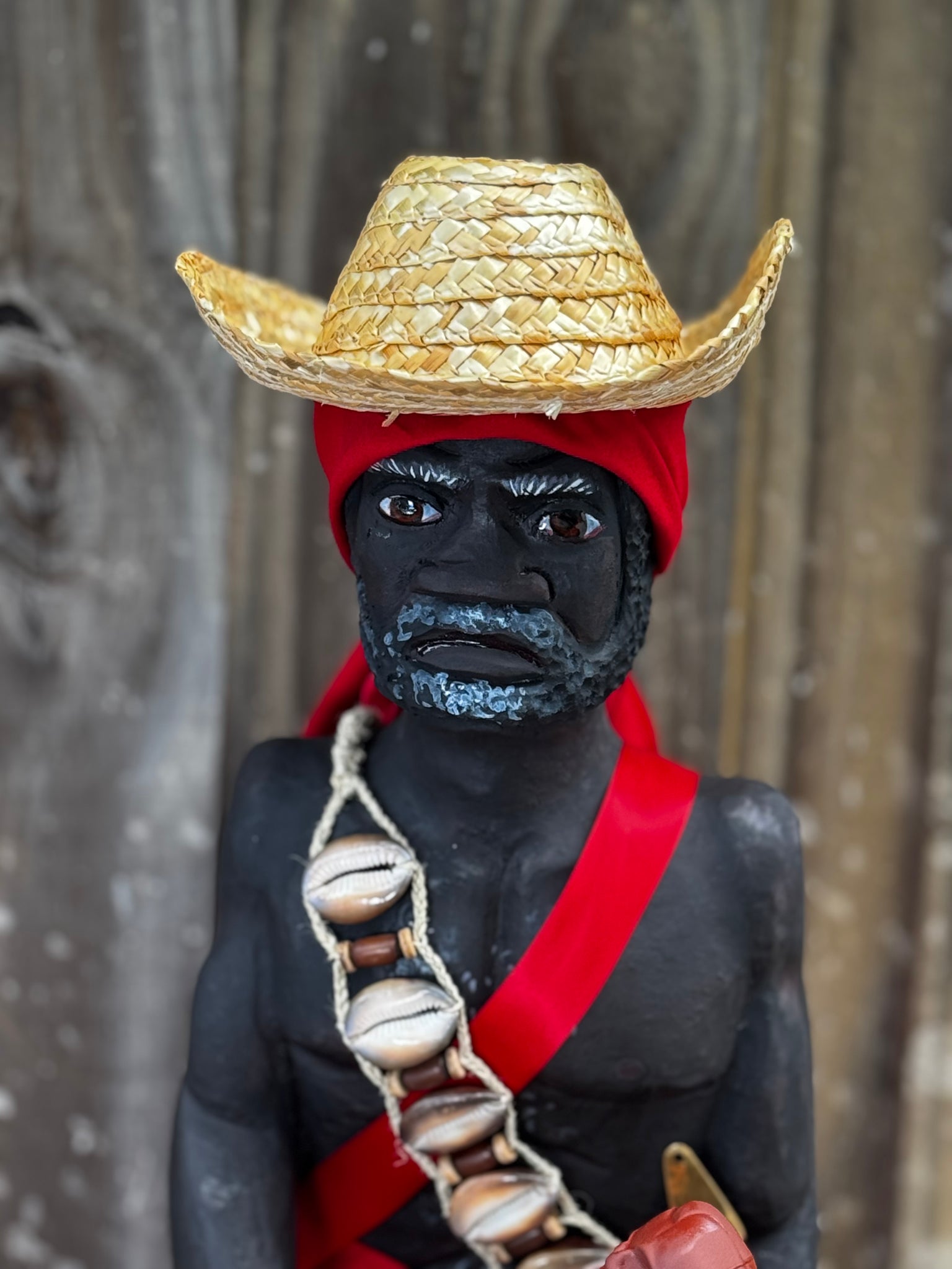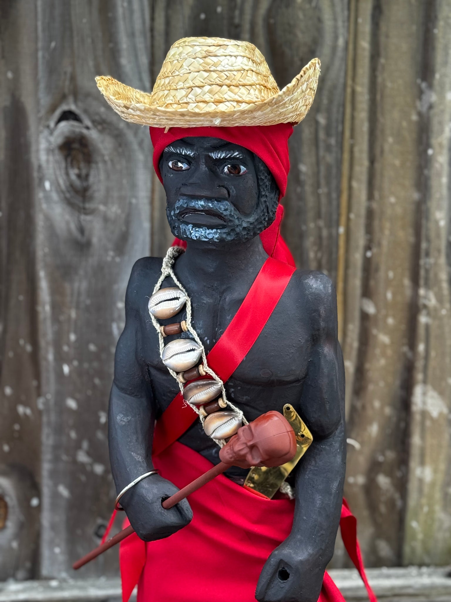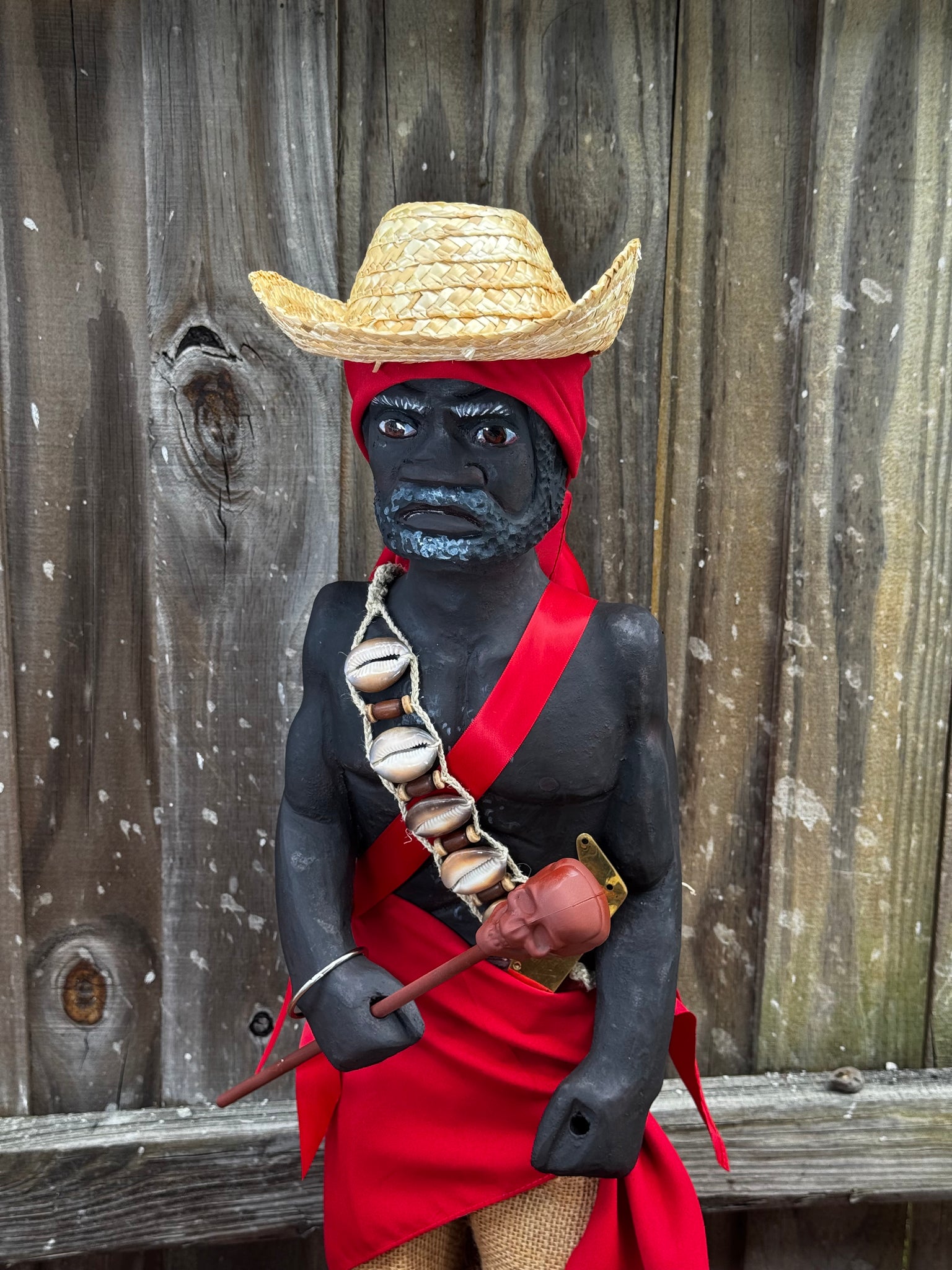 Con sus 28 pulgadas de altura, desde la base hasta el sombrero, se yergue imponente, como un sÃmbolo de respeto y fuerza. Su vestimenta roja vibra con la intensidad del fuego y la pasión, mientras que los caracoles, el bastón y sus accesorios evocan conexión con la tierra, la naturaleza y el misticismo que lo rodea.Agregue algo de saco simulando su short de yuteÂ